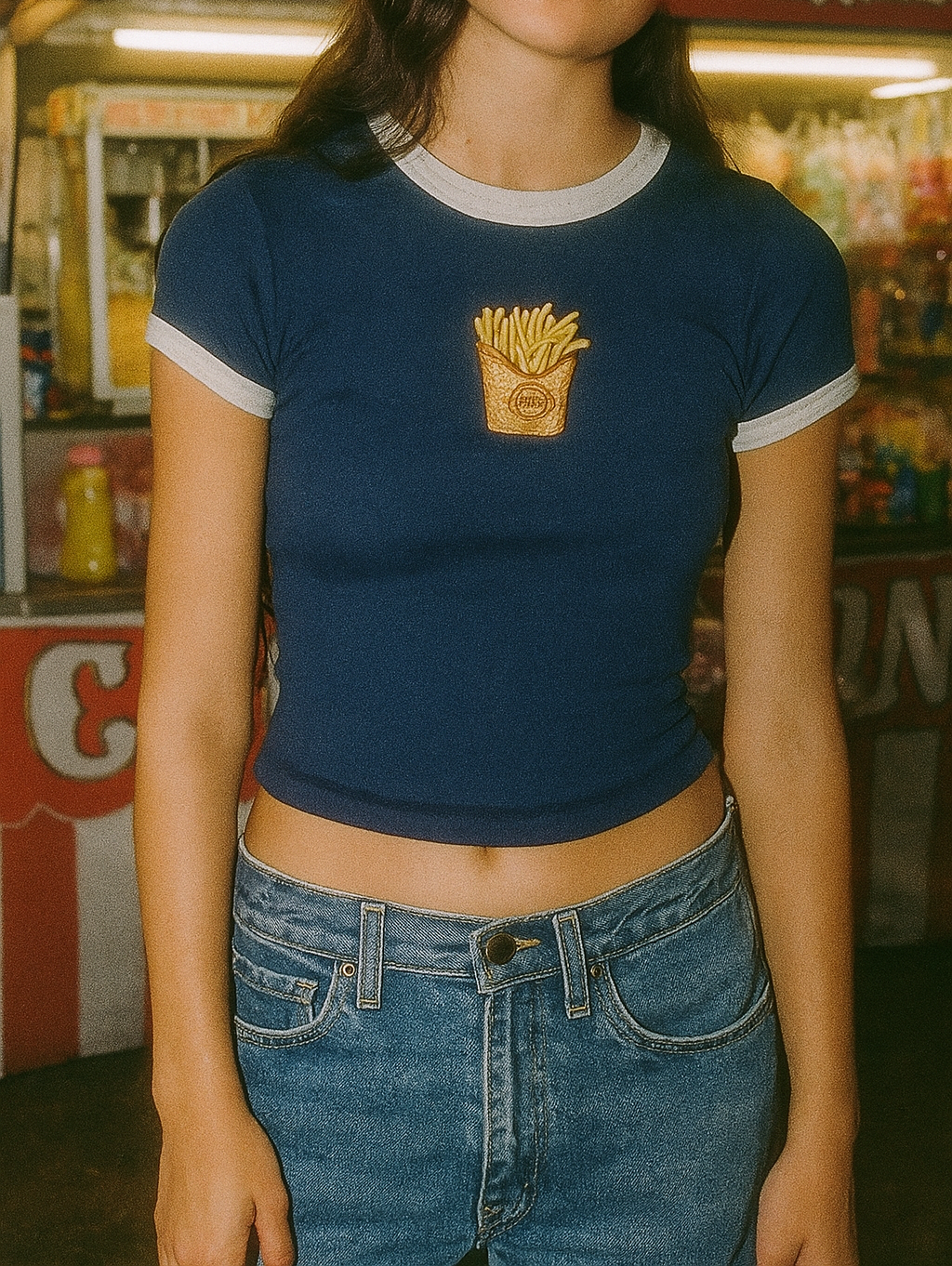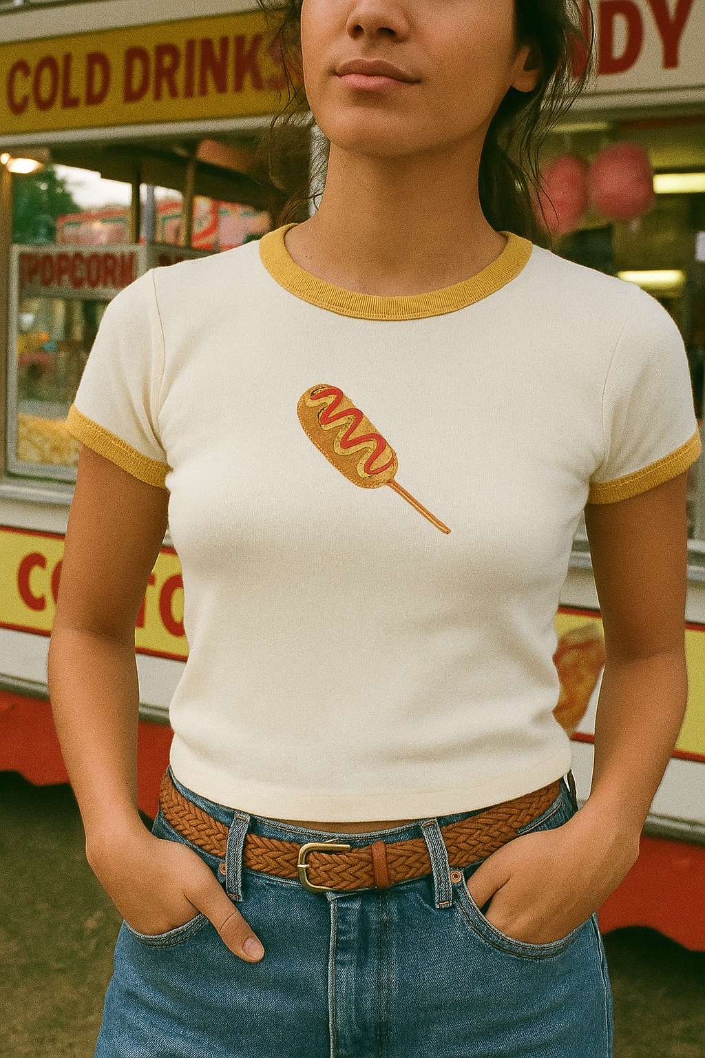 concession stand baby tee, graphic ringer tee, Y2K crop tee, snack-themed shirt, cute carnival tee, retro food tee, french fry shirt, corndog tee, pretzel t-shirt, blueberry jam t-shirt, canned peaches baby tee, club sandwich graphic tee, aesthetic food clothing, festival ringer top, vintage diner fashion, novelty embroidered top