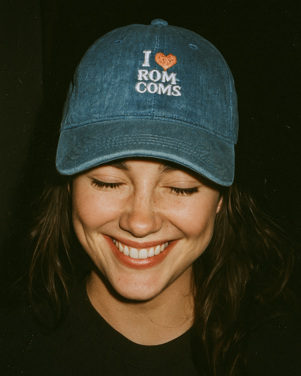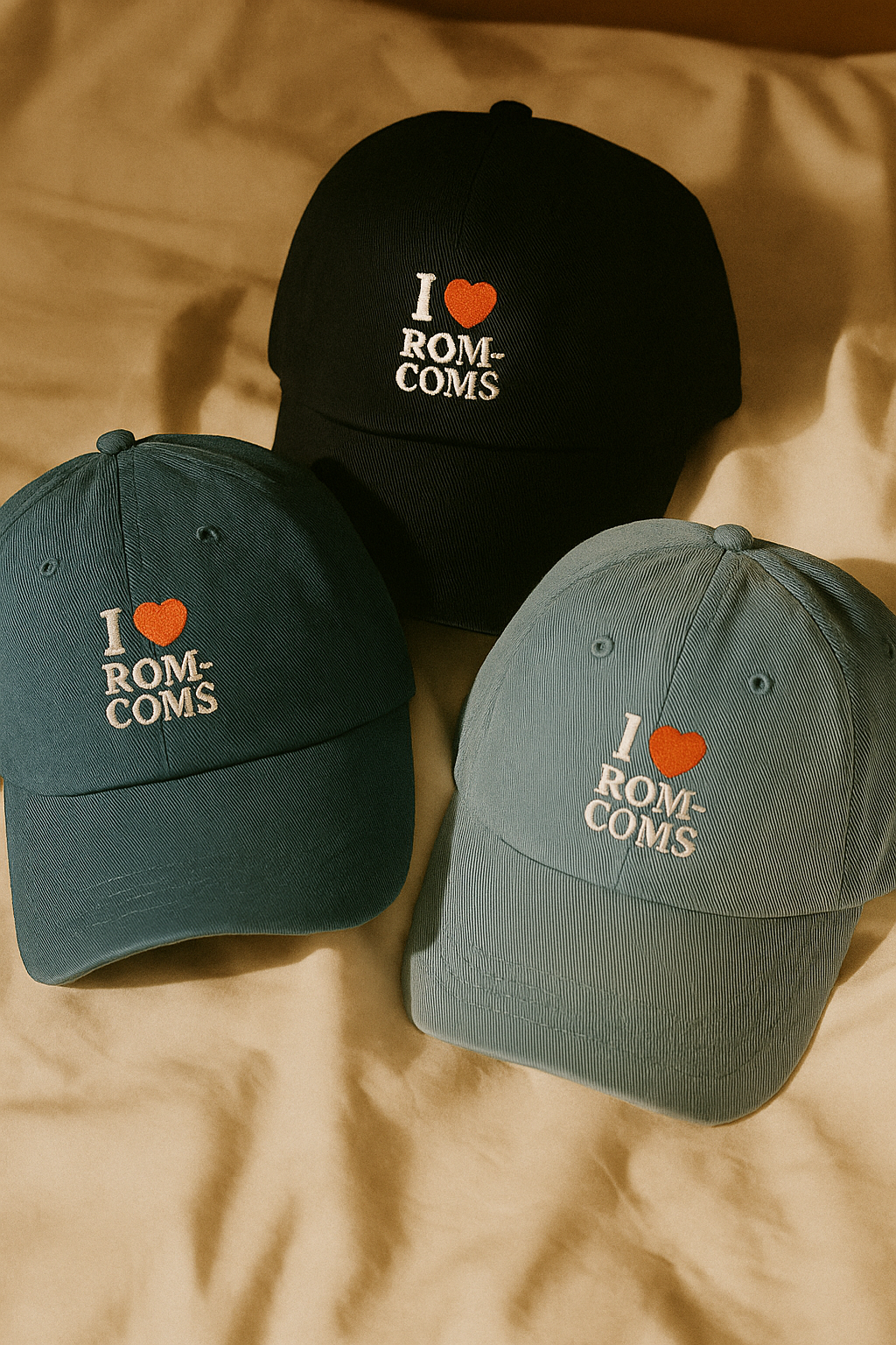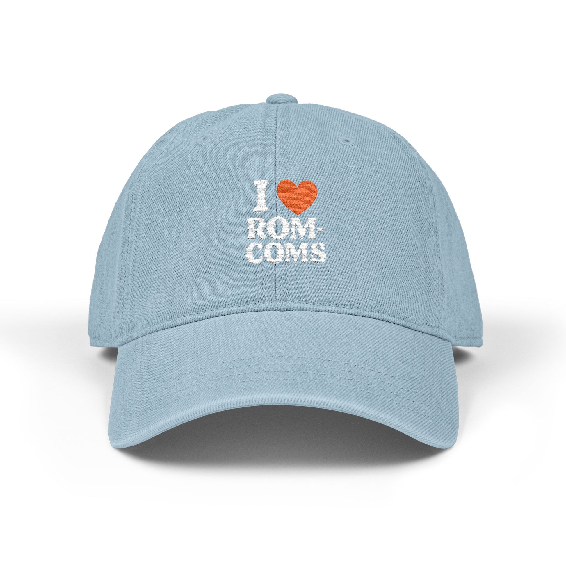 rom com hat, embroidered I love rom coms cap, denim dad hat, unstructured cotton hat, rom-com aesthetic accessory, romantic movie merch, cute embroidered vintage cap, gifts for movie lovers, meet cute fashion, retro film-inspired hats