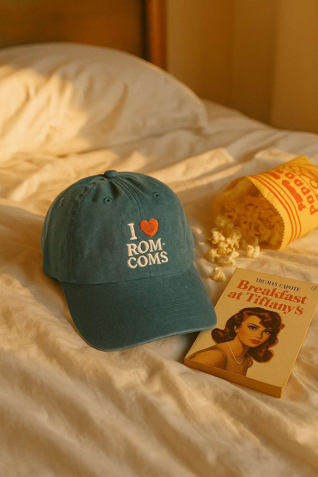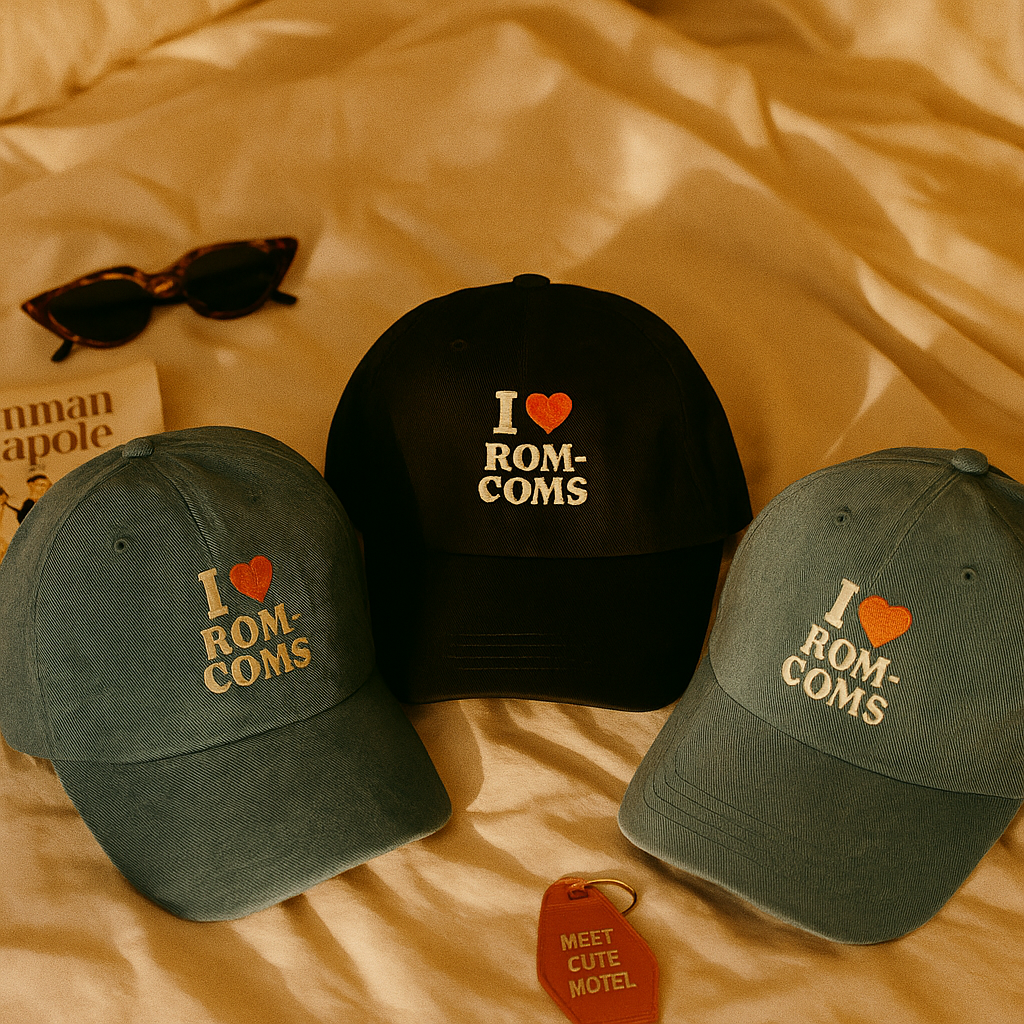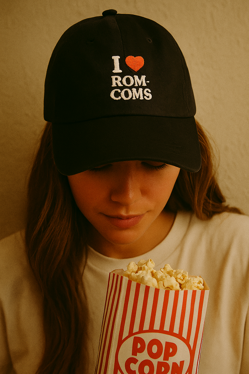 rom com hat, embroidered I love rom coms cap, denim dad hat, unstructured cotton hat, rom-com aesthetic accessory, romantic movie merch, cute embroidered vintage cap, gifts for movie lovers, meet cute fashion, retro film-inspired hats