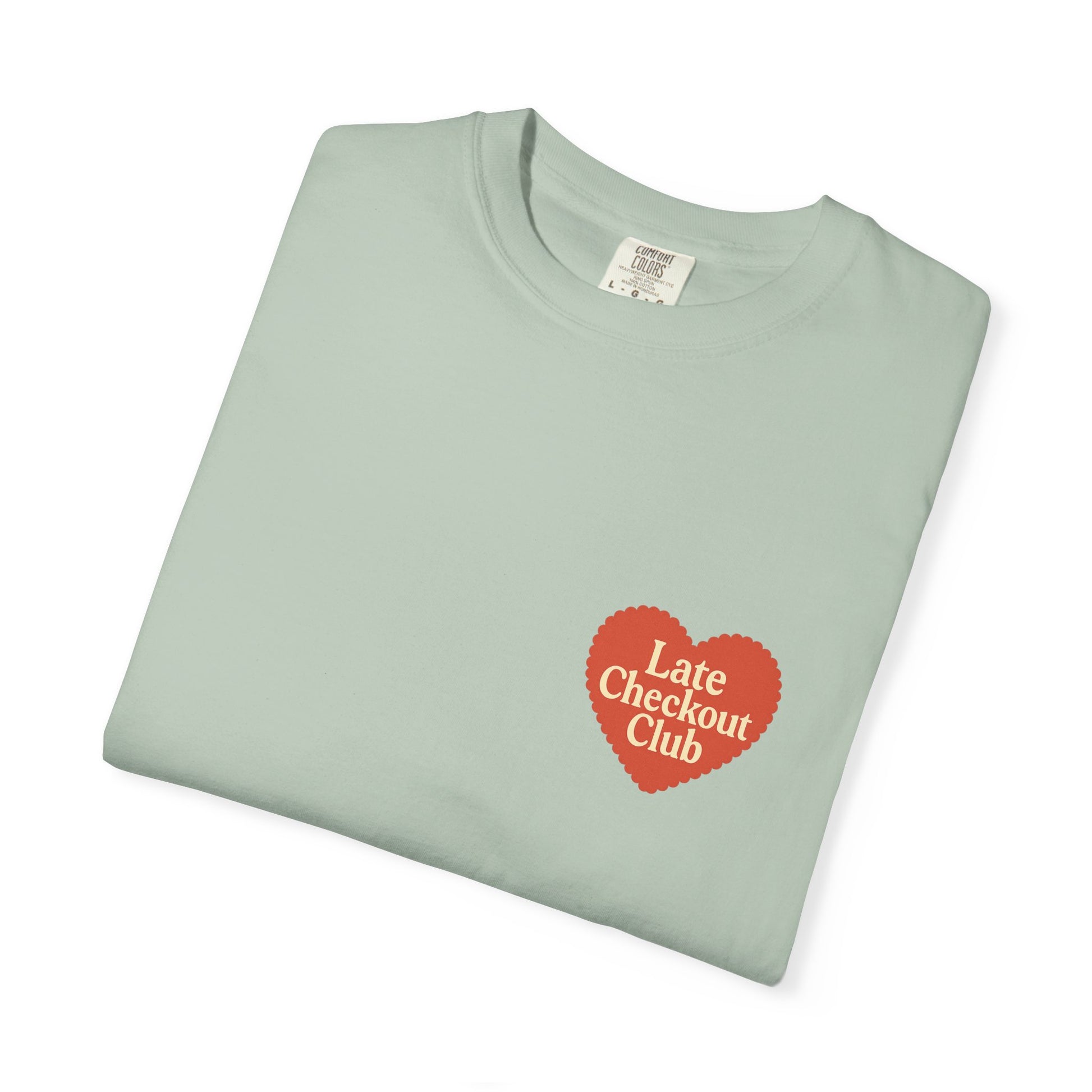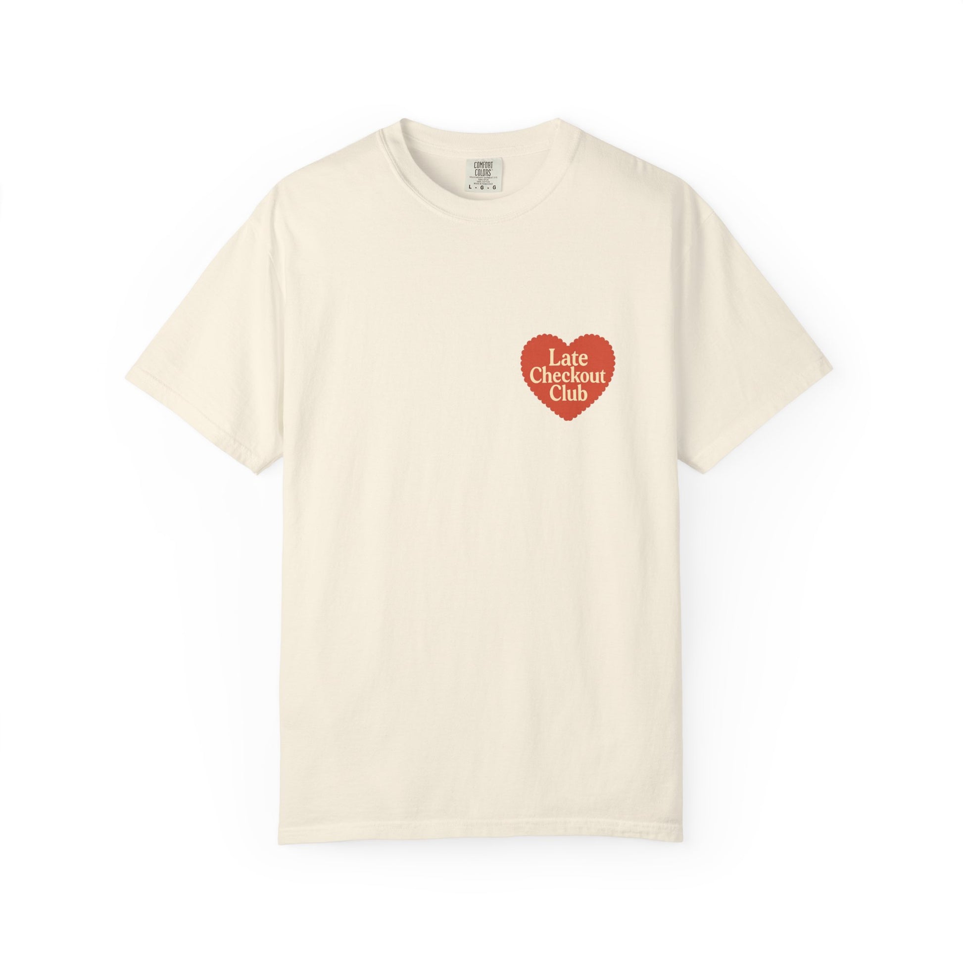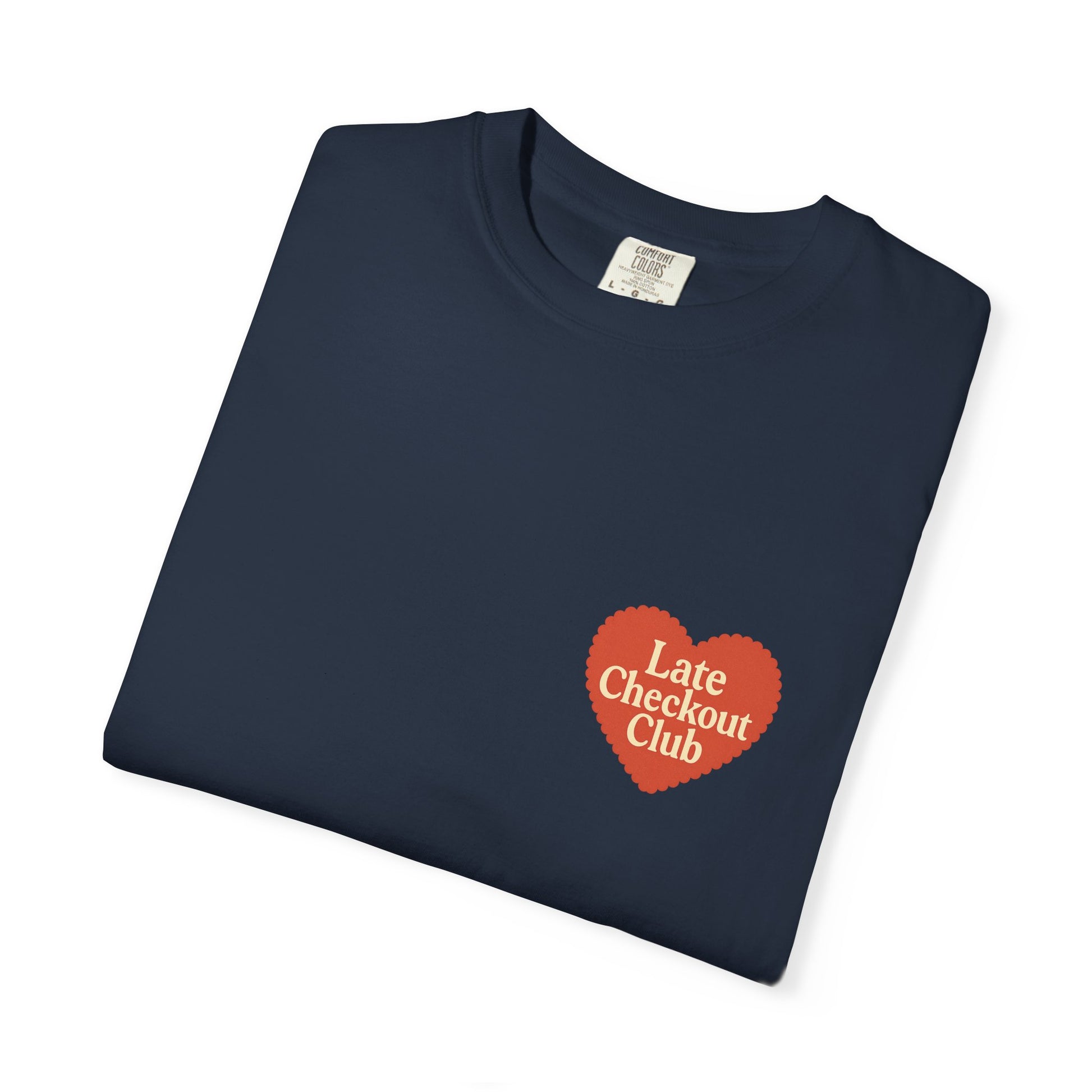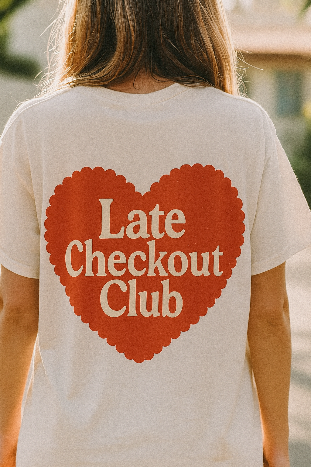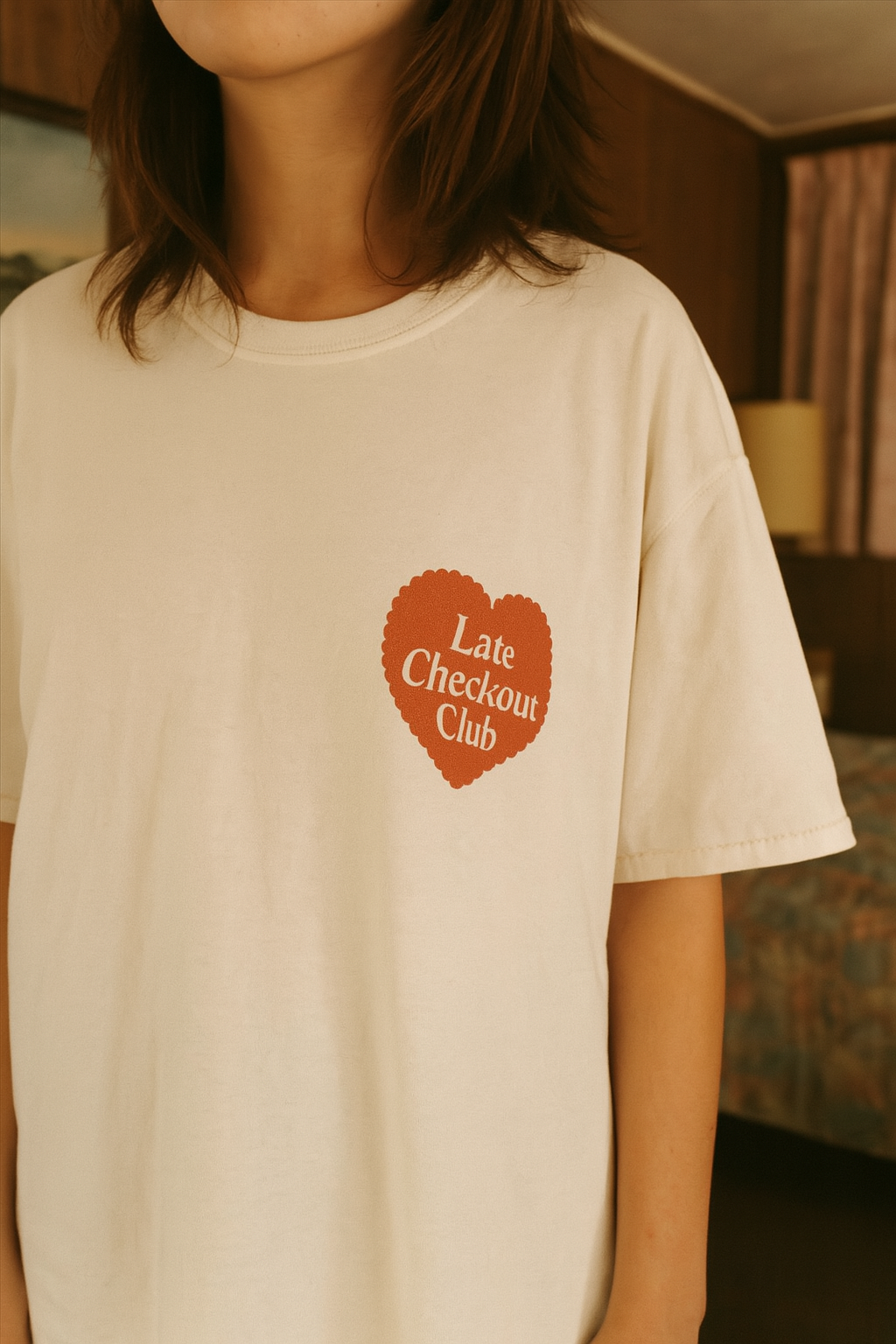 The Late Checkout Club tee is for the slow risers, the dreamers, the ones who hit snooze without shame and linger under motel sheets long after checkout time. Featuring a retro heart graphic on the back and a mini version on the front, this oversized tee gives you full permission to sleep in, stay cozy, and check out on your own time.