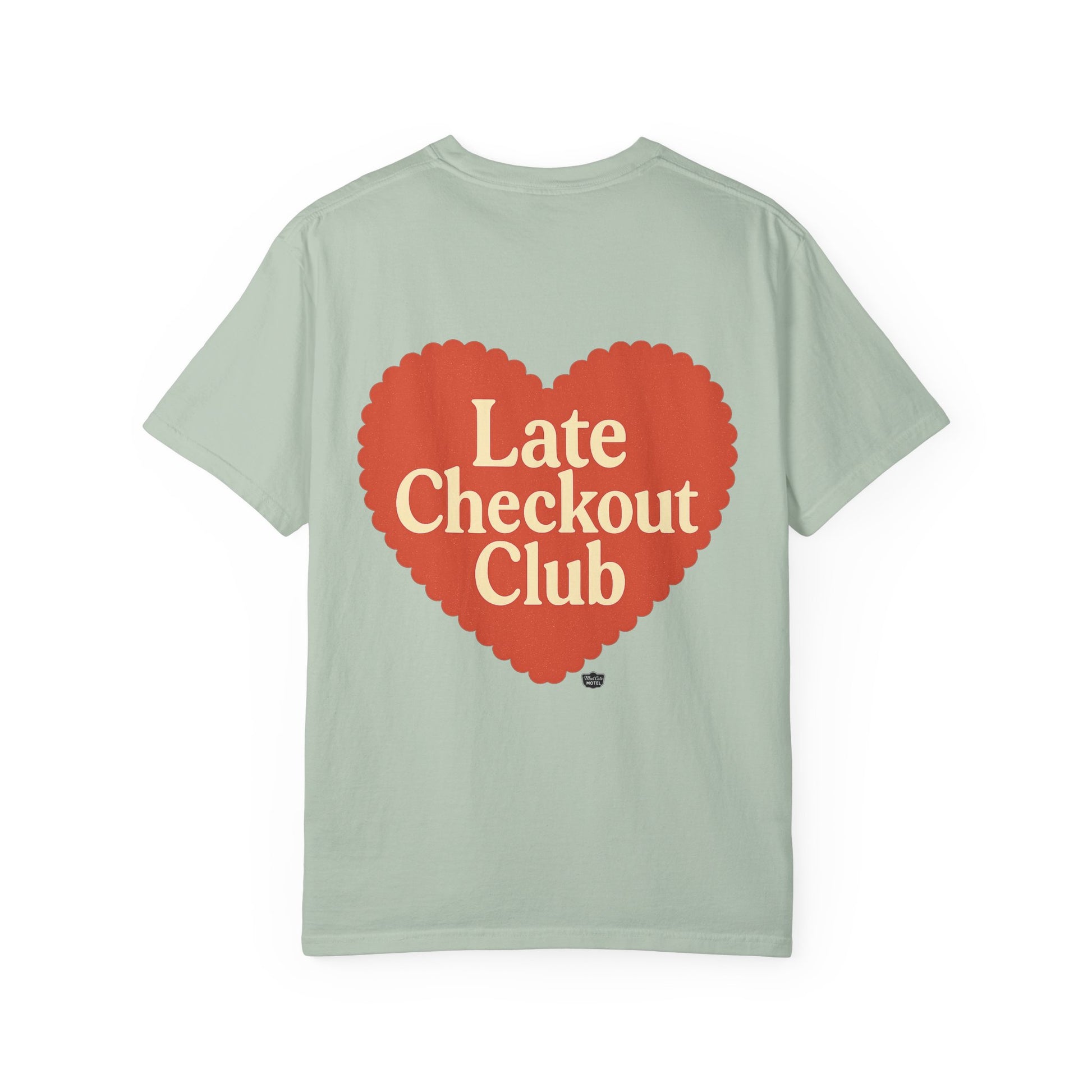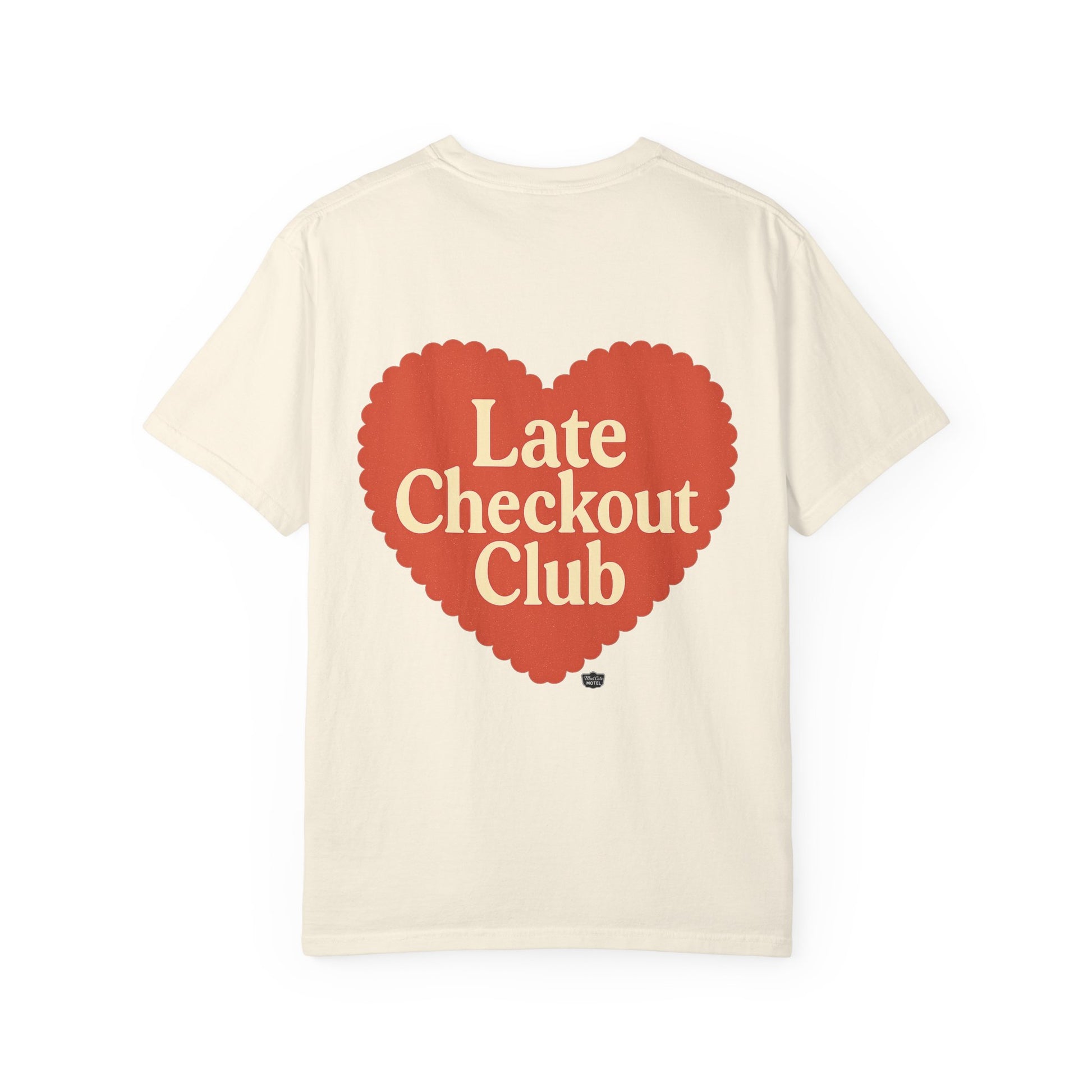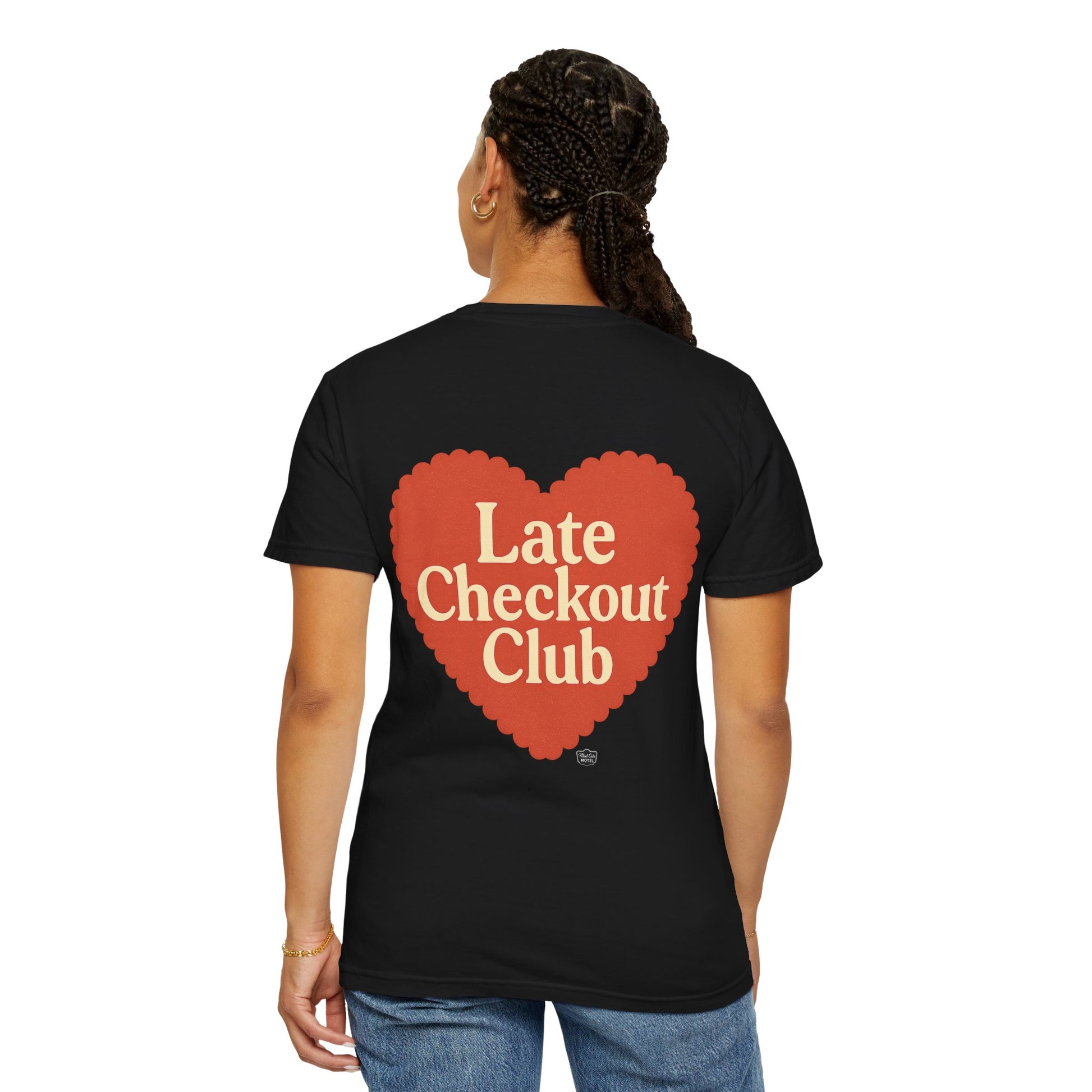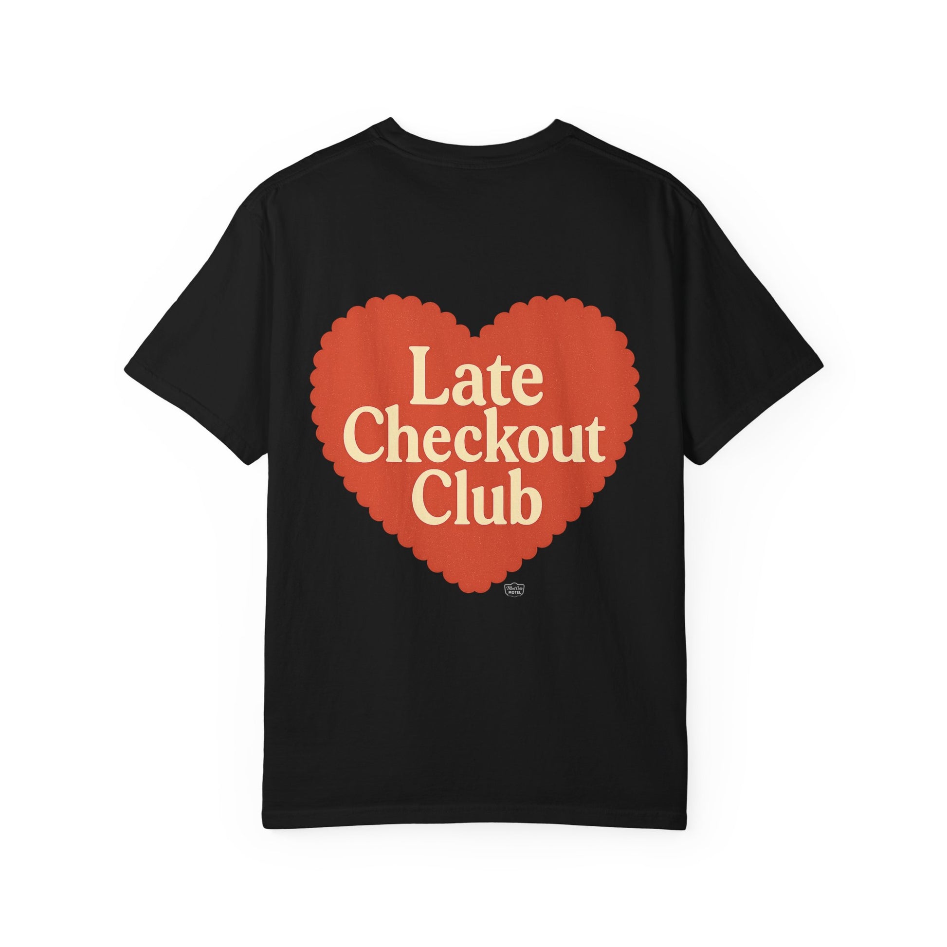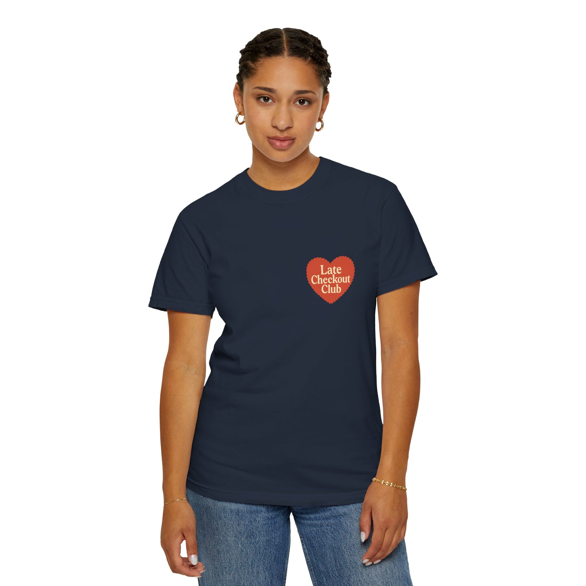 The Late Checkout Club tee is for the slow risers, the dreamers, the ones who hit snooze without shame and linger under motel sheets long after checkout time. Featuring a retro heart graphic on the back and a mini version on the front, this oversized tee gives you full permission to sleep in, stay cozy, and check out on your own time.